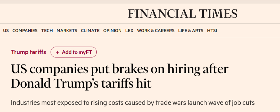 英国《金融时报》14日发表题为《美国政府的关税政策导致企业停止招聘》的文章,文章称,受特朗普关税政策的影响,美国一些最容易受到关税冲击的行业已经停止招聘,部分公司甚至开始裁员,这导致美国劳动力市场的增长陷入停滞。